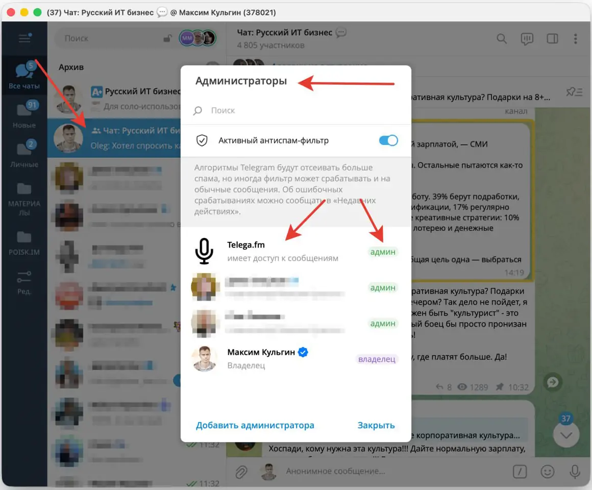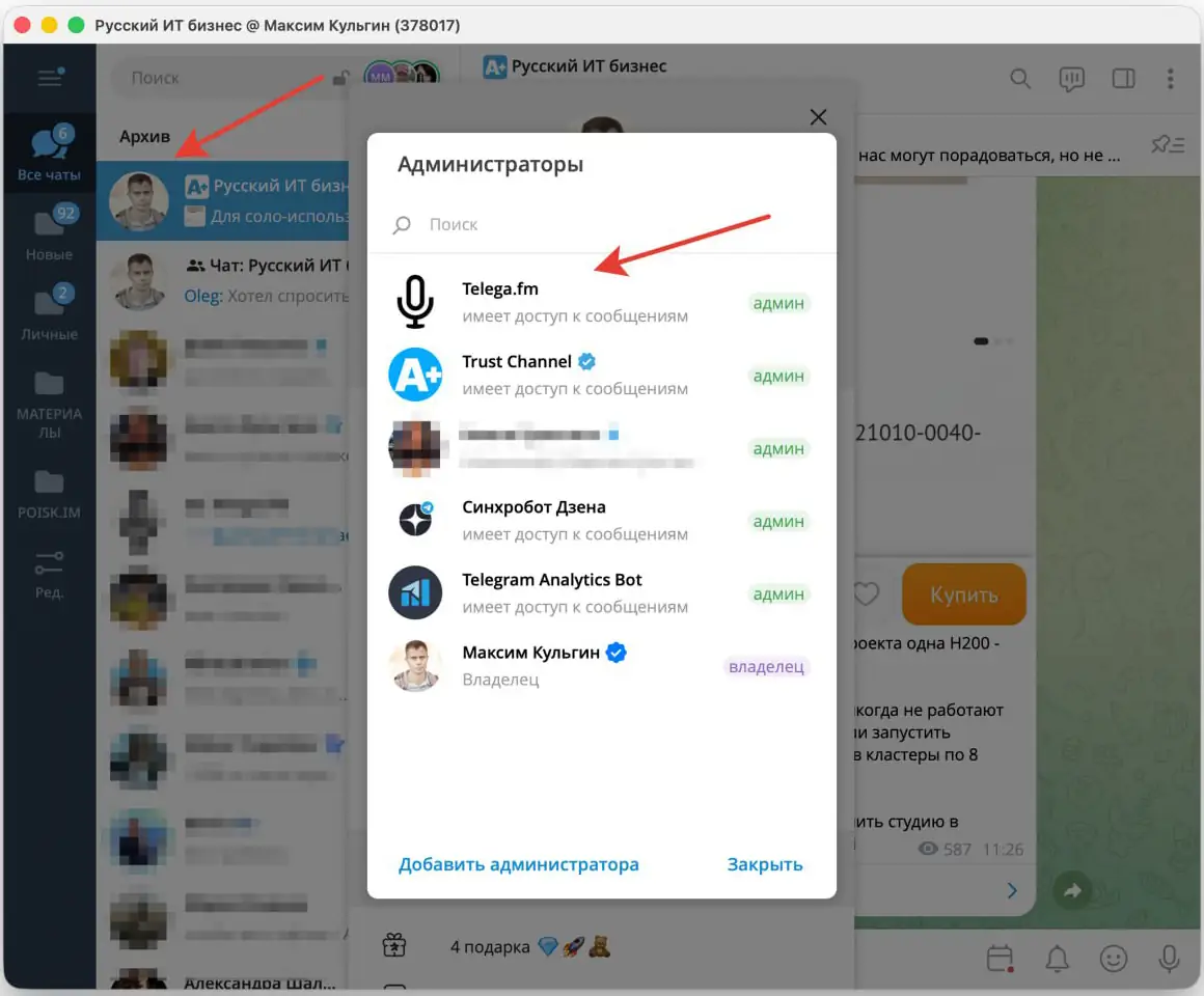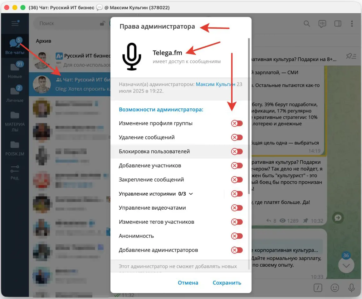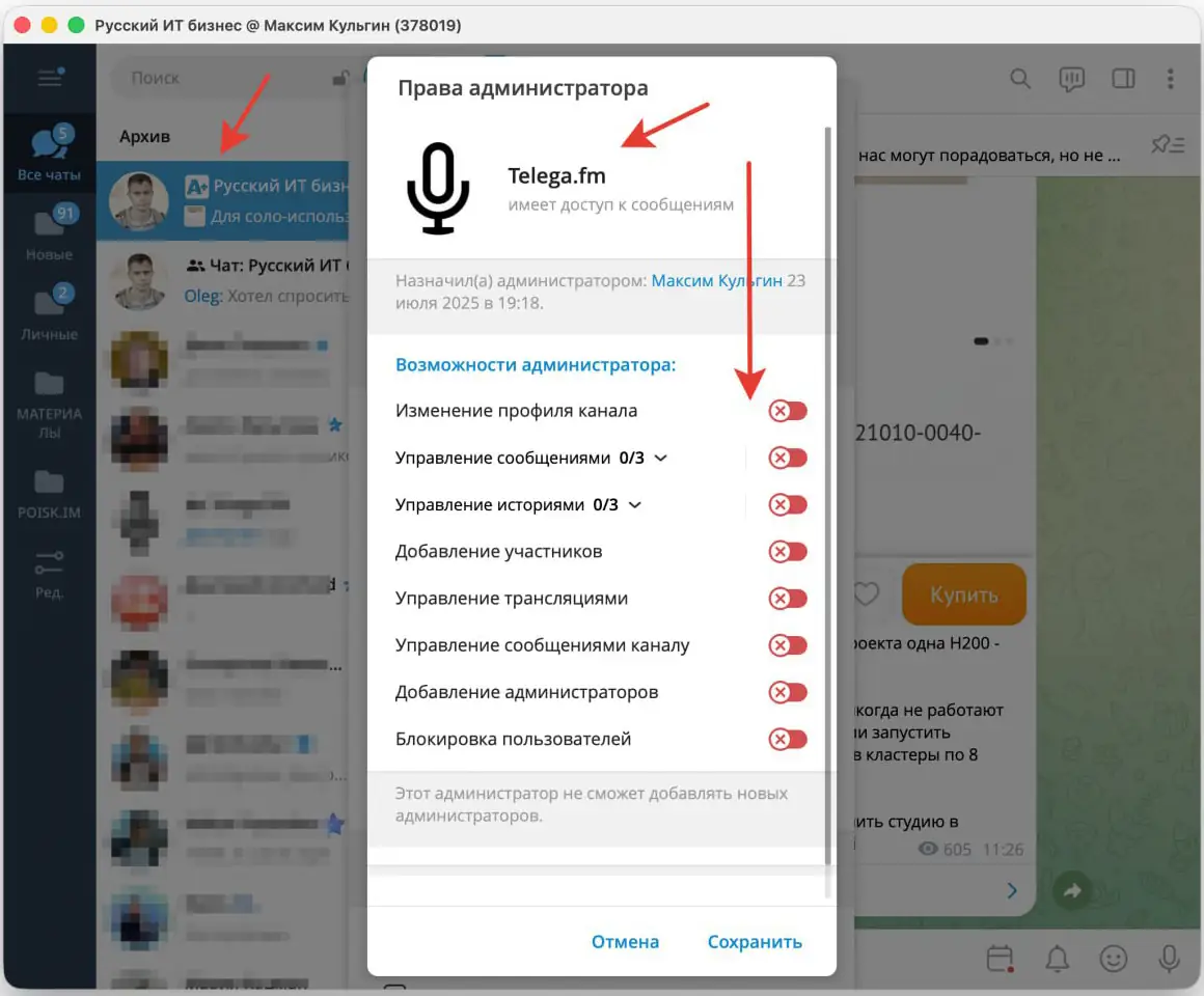 - Предоставить права администратора. Обязательно включить право на чтение сообщений.