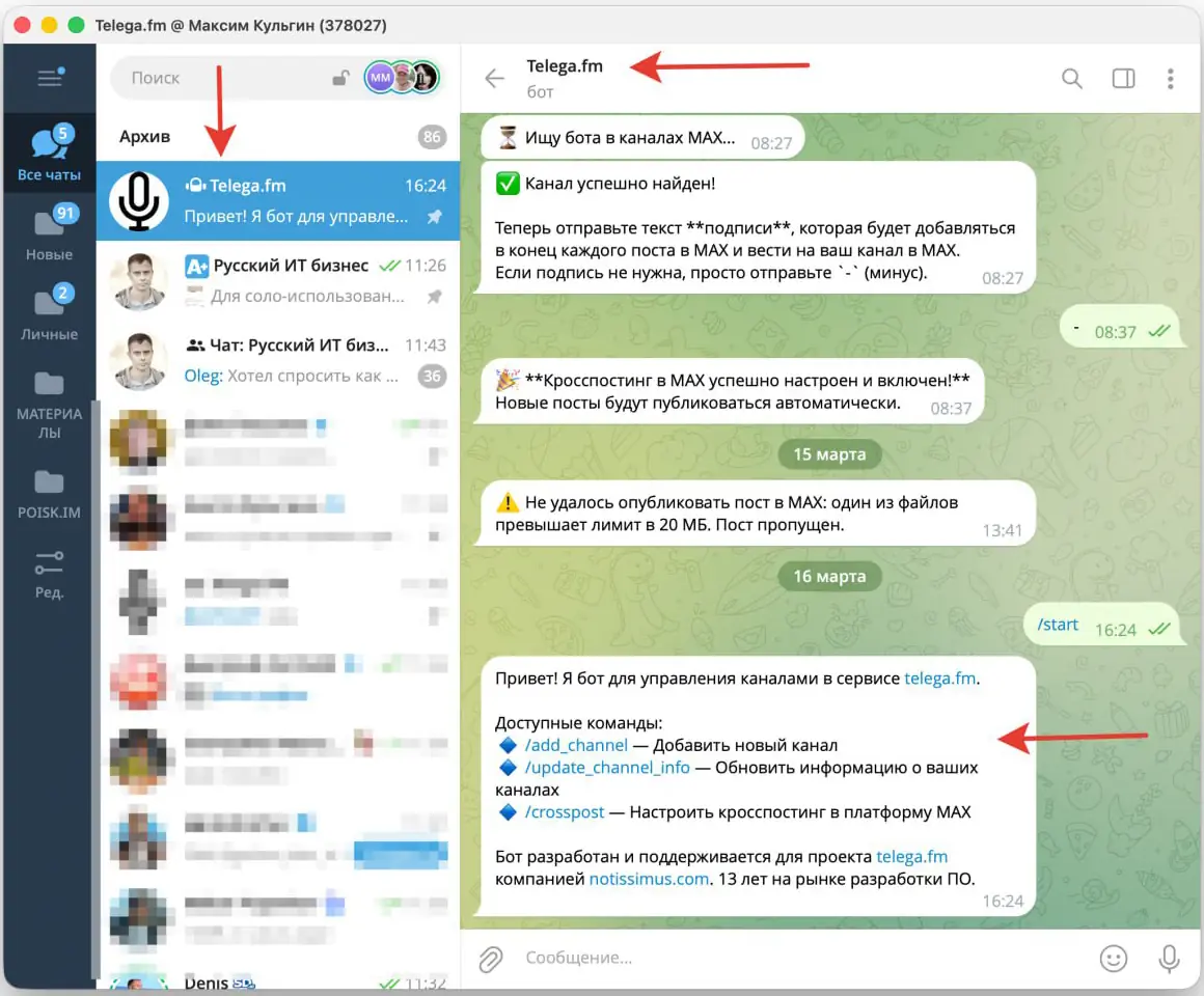 /add_channel— Добавление Telegram-канала в систему./update_channel_info— Принудительное обновление данных об источниках./crosspost— Настройка автоматической пересылки записей на платформу MAX.